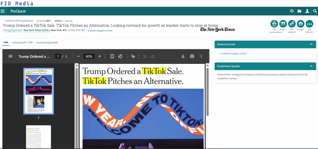 Loggen Sie sich in das FID-Portal ein. Damit werden Sie als Nutzer:in des FID erkannt und können alle für Sie freigeschalteten Funktionalitäten nutzen. Sie gelangen über die Datenbanken-Seite des FID Media auf die Übersicht aller lizenzierten Datenbankinhalte und finden dort die drei Tageszeitungen. Von dort gelangen zu ProQuest und können die verschiedenen Recherchemöglichkeiten nutzen. Der Zugang steht kostenfrei für registrierte Nutzende des FID Media zur Verfügung, die im Fach forschen oder lehren.