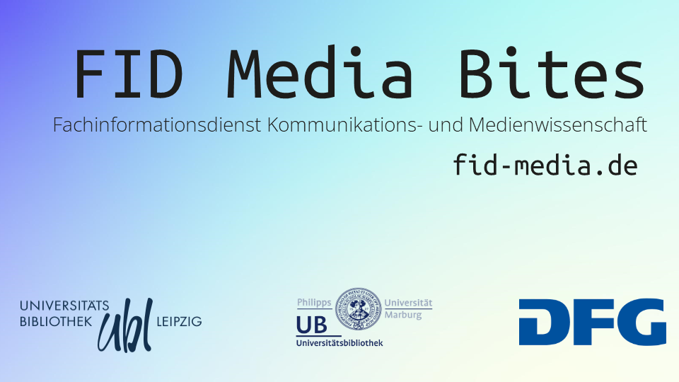 Die FID Media Bites bieten praxisnahe Wissenshappen für die Kommunikations- und Medienwissenschaft. Zu jedem Termin steht ein Thema aus den Bereichen wissenschaftliches Publizieren, Urheberrecht, Open Science, Tools oder Forschungsdaten im Mittelpunkt, und zwar jeweils mit dem Fokus auf den fachspezifischen Rahmenbedingungen der Kommunikations- und Medienwissenschaft.